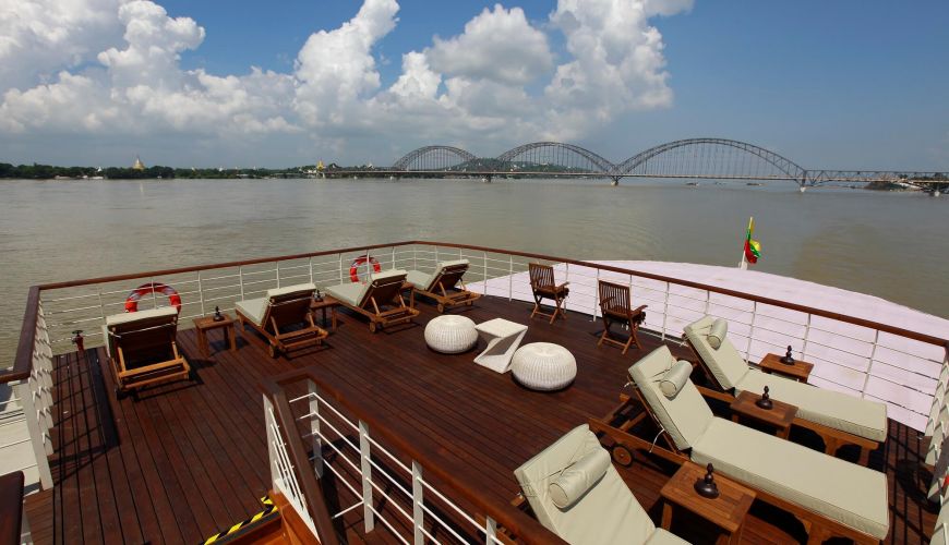 Das Oberdeck bietet 02 Kabine am Bogen mit einer Fläche von 25 qm, Doppelbett/Zwei Einzelbette. Das Design des Zimmers ist eine ausgezeichnete Kombination aus modernem zeitgenössischem, traditionellem Burmesischem Stil und britischem Kolonialstil, gefertigt von Teak mit antiken Handwerken. Alle Kabinen sind mit Klimaanlage und erstklassigen Einrichtungen ausgestattet, einschließlich einem privaten Badezimmer und fantastischen Balkon mit perfektem Blick auf den Fluss.